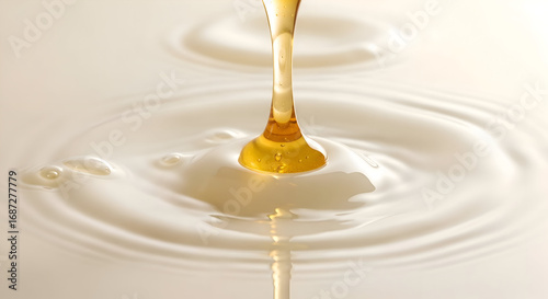 Golden honey pouring into creamy white liquid creating ripples and reflections