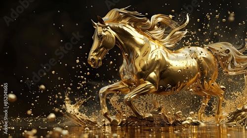 Golden Horse Splash Art Abstract Fluid Motion Dynamic Sculpture. Mural, wallpaper and background gold horse. High quality AI generated image