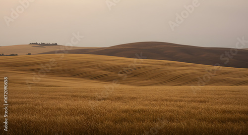Golden hour bathes undulating wheat fields, revealing serene layers and distant tree silhouettes against a muted sky,