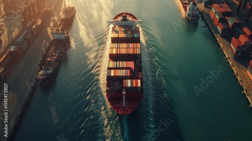 Golden Hour Cargo Ship: Majestic container ship sailing through a harbor at sunset, viewed from a high-angle aerial perspective.