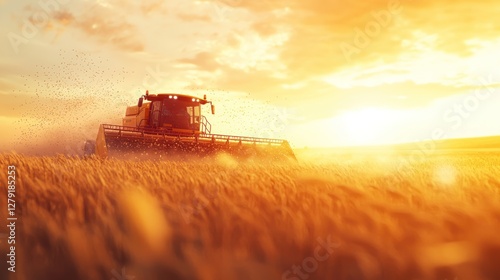 Golden Hour Harvest: A Combine Harvester Gleans Ripe Wheat at Sunset