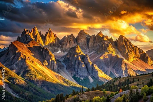Golden Hour Illuminates rugged mountain peaks and valleys with warm, rich colors and textures, casting dramatic shadows and highlights.