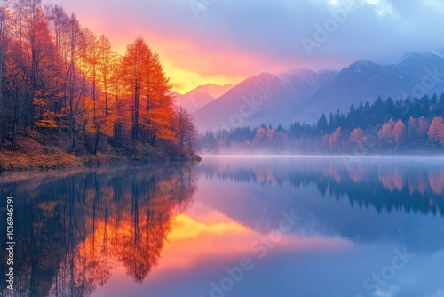 Golden hour illuminating forest reflecting in calm lake at sunrise