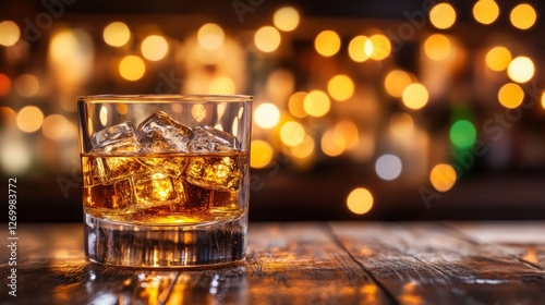 Golden Hour Indulgence A Glass of Whiskey with Ice on Rustic Wood, Lit by Twinkling Bokeh