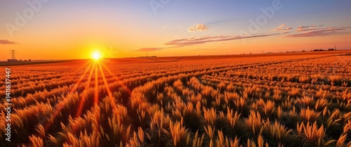 Golden hour light bathes a vast field, long shadows stretching towards the setting sun, beauty, image