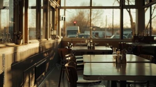 Golden hour light gently fills an empty diner, casting soft shadows over the clean tables and chairs, giving a nostalgic, serene feel.