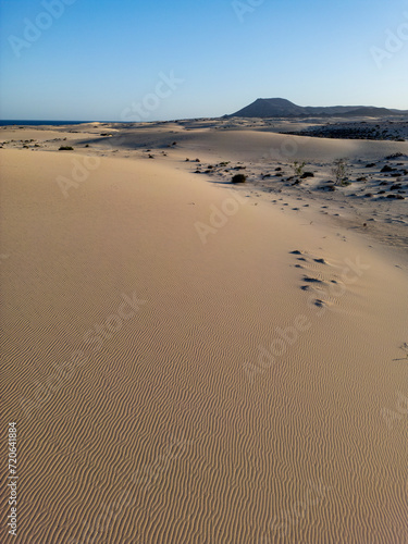 Golden hour light washes over the sandy beach with rock formations at Corralejo Dunes, overlooking the sea in Fuerteventura