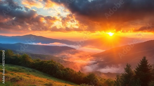 Golden Hour Mountain Majesty: Serene landscape photography captures the breathtaking beauty of a sunset over majestic mountains, bathed in warm golden light.