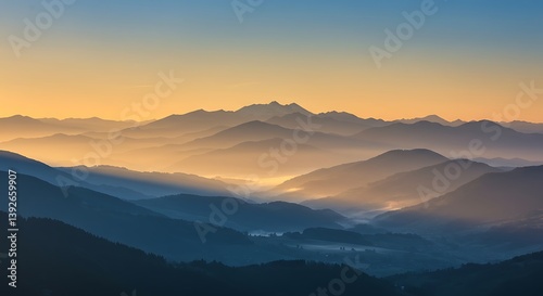 Golden Hour Mountain Range Landscape Photography: Serene Sunrise Over Misty Peaks AI Generated