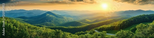 Golden Hour Mountain Vista: A breathtaking panorama of rolling green mountains bathed in the golden hues of a breathtaking sunset. The sun peeks through the clouds, casting a warm.