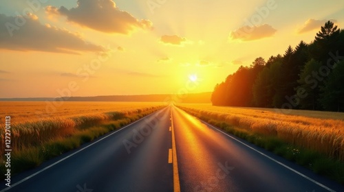 Golden Hour Road Trip A Scenic Asphalt Path Through Sun-Kissed Fields at Sunset