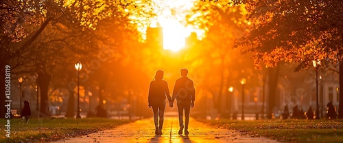 Golden Hour Romance: Couple Walking Hand-in-Hand at Sunset