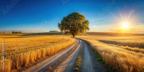 Golden Hour Serenity A Country Road Winds Through a Sunlit Wheat Field, Beneath a Majestic Tree at Sunset