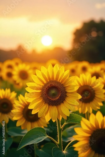 Golden hour sunlight bathes a vibrant yellow field of sunflowers, creating a breathtaking scene of natural beauty and warmth Perfect for summer, nature, and growth themes , plant, bright yellow