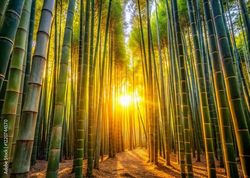 Golden Hour Sunlight Filtering Through Dense Bamboo Forest at Dusk
