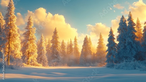 Golden Hour Sunset In Snowy Pine Forest