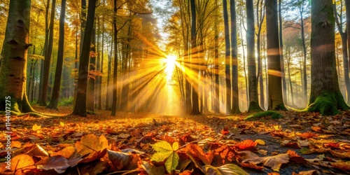 Golden hour's magic: sunbeams pierce misty autumn woods, creating breathtaking landscape images.