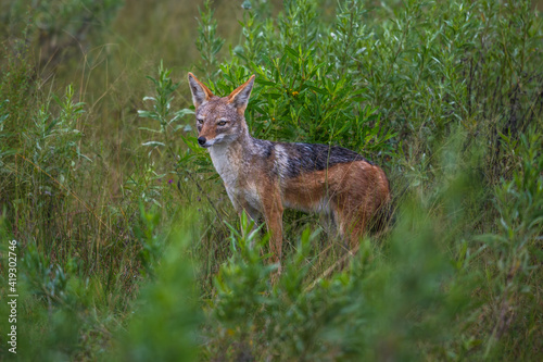 Golden Jackal, Canis aureus, with evening sun in the grass, Sri Lanka, Asia. Beautiful wildlife scene from nature habitat from Sri Lanka.