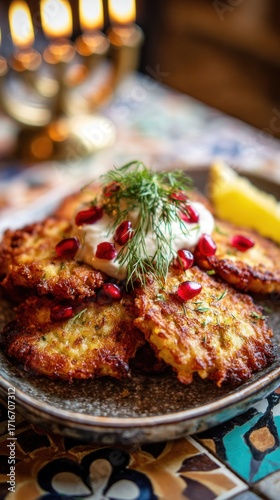 Golden latkes served on a decorative platter with labneh, pomegranate seeds, and fresh herbs, creating a vibrant and inviting culinary presentation
