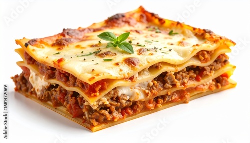 Golden layered lasagna slice with melted cheese tomato sauce pasta sheets meat filling appetizing Italian dish isolated on white background
