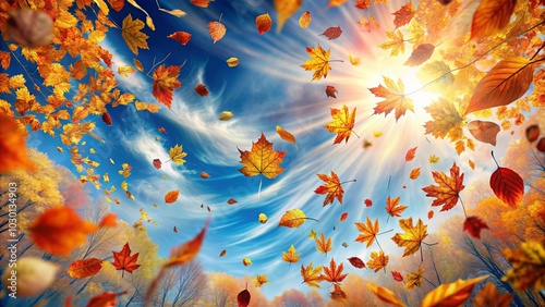 Golden Leaves Dance in the Autumn Breeze, A Symphony of Color Against a Sky of Azure and White Clouds