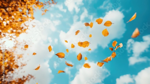Golden leaves fluttering against a bright blue sky, creating a contrast between earth and sky.