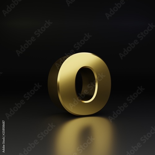 Golden letter O lowercase. 3D render shiny metal font isolated on black background