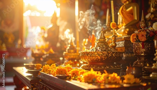 Golden Light Illuminates Serene Buddha Statues and Offerings in a Tranquil Temple Setting