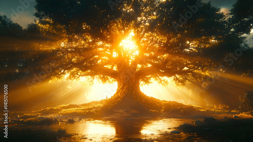 Golden light shines through a large tree illuminating the surrounding landscape Water reflects the light at its base
