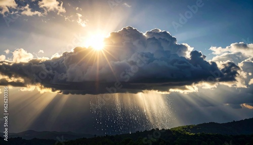 Golden light streams from a cloudy sky, highlighting a gentle rainfall and creating a stunning atmospheric display of nature's power and beauty across the horizon
