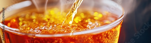 Golden liquid being poured into a glass with steam above it