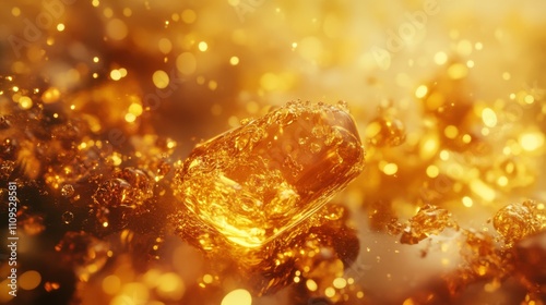 Golden liquid cube with bubbles and bokeh.