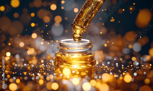 Golden liquid dripping from a pipette into a glass jar with blurred lights background
