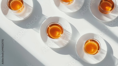 Golden liquid is served in delicate glass vessels on a clean, bright surface with soft shadows creating a minimalist aesthetic