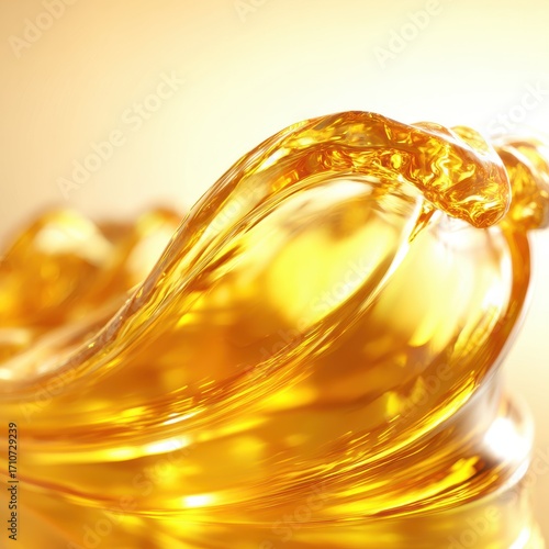Golden liquid splash in motion close up studio shot with smooth curves and warm light for product background