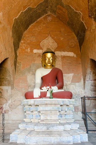 Golden masked ancient Buddha statue at Htilo Minlo Pagoda, Bagan