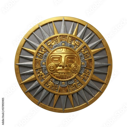 Golden mayan calendar depicting sun god tonatiuh with silver rays