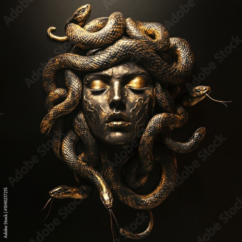 Golden Medusa with Serpent Hair in Dark Background