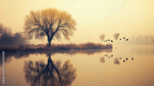 Golden Misty Dawn Lone Tree with Birds, and Serene Lake Reflection.