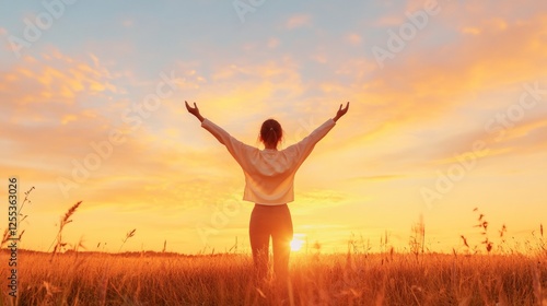 Golden Morning Empowerment Young Woman in Scenic Sunrise Field - Vibrant Positivity Stock Image for Wellness Campaigns and Outdoor Mindfulness Branding