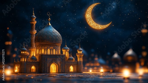 Golden Mosque under Crescent Moon in Starry Night Sky radiates spiritual peace and tranquility, reflecting Islamic faith
