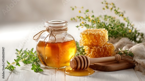 Golden Nectar: Capturing the essence of nature's sweetness. A jar of golden honey and honeycomb are accompanied by a honey dipper and fresh herbs on a rustic, wooden surface.