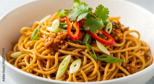 Golden noodles with savory topping, red pepper slices and fresh herbs in bowl.
