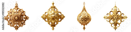 Golden ornament hanging isolated on transparent background, Set of