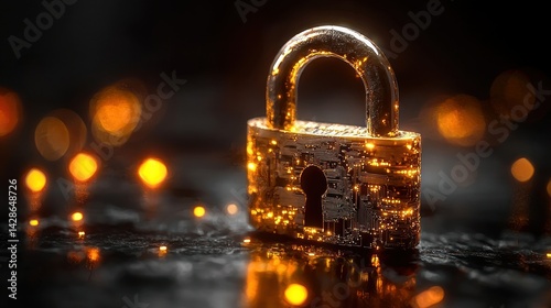 Golden padlock glows, showing digital network security
