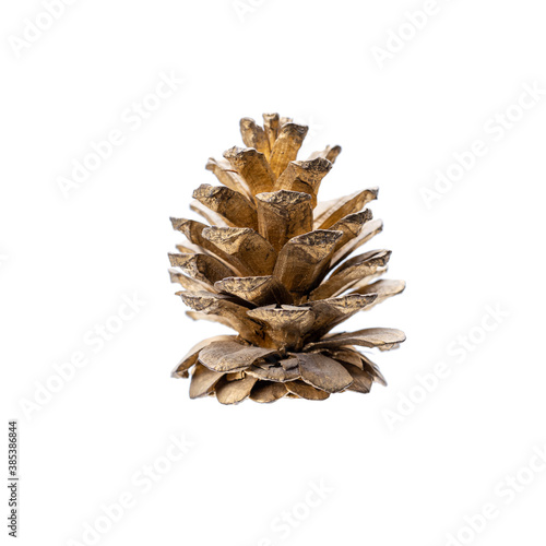 golden painted conifer cone isolated on a white background. pine cone for christmas decoration
