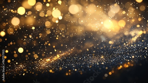 Golden particles on dark background, flying glittering shiny sparkles on black banner, event party holiday Christmas design, Generative AI