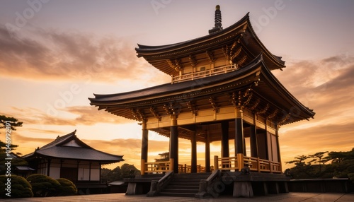 Golden pavilion at sunset in a traditional Japanese garden setting with serene atmosphere