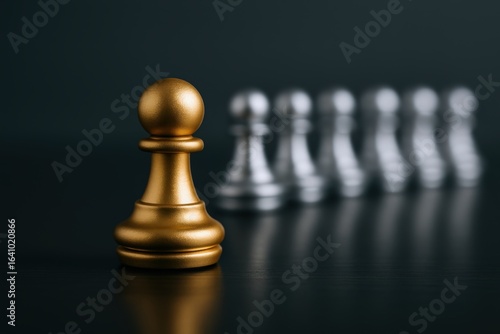 Golden Pawn Chess Piece Leading Silver Pawns on Dark Background - Strategy and Leadership Concept