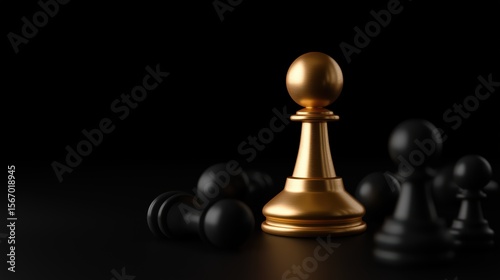 Golden pawn standing victorious among fallen black pawns on dark background—symbol of leadership, resilience, unexpected success, and strategic dominance.